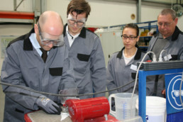Einen Besuch der ungewöhnlichen Art hat der heimische Bundestagsabgeordnete Dr. Peter Tauber dem AQA-Standort in der Hanauer Donaustraße abgestattet. Gemeinsam mit seinem Bundestagskollegen Kai Whittaker, CDU-Abgeordneter aus dem baden-württembergischen Wahlkreis Rastatt und Mitglied im Ausschuss für Arbeit und Soziales sowie darüber hinaus ausgewiesener Arbeitsmarktexperte, informierte sich der CDU-Generalsekretär zum wiederholten Mal über die Arbeit der Gemeinnützigen Gesellschaft für Arbeit, Qualifizierung und Ausbildung (AQA) – und das nicht nur in der Theorie, sondern auch ganz praktisch an der Werkbank: Im grauen Arbeitskittel, ausgestattet mit Schutzbrille, Glasschneider und Lötkolben galt es für Tauber und Whittaker eine praktische Übungssequenz zu absolvieren – eine Aufgabe, die die beiden Politiker nach Aussage der anleitenden Teilnehmerin mit erstaunlichem Geschick bewältigten.